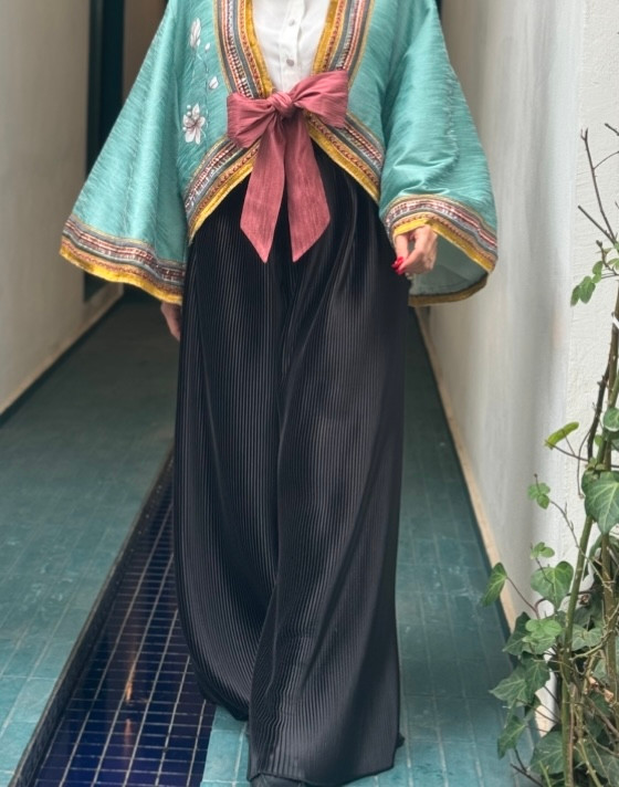 جزئیات: شلوار پلیسه مشکی و ابی کمر کش