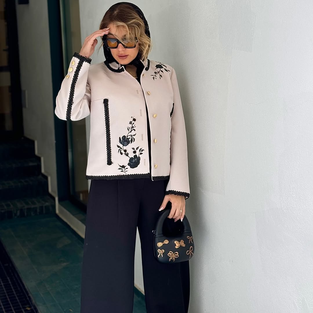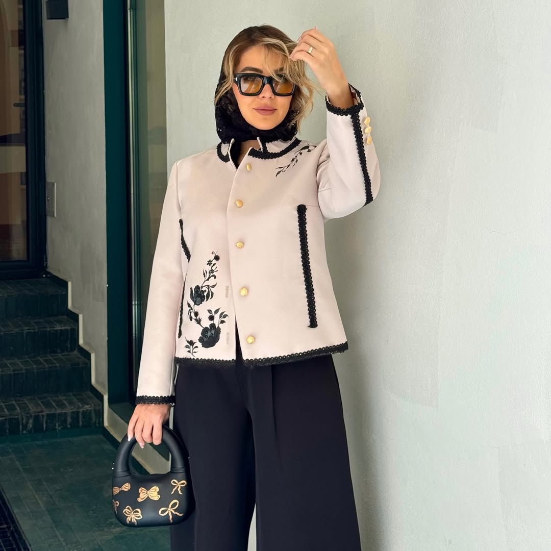 کت ساتن امریکایی زنانه رنگ کرم ترکیب نقاشی دست و مرواربد